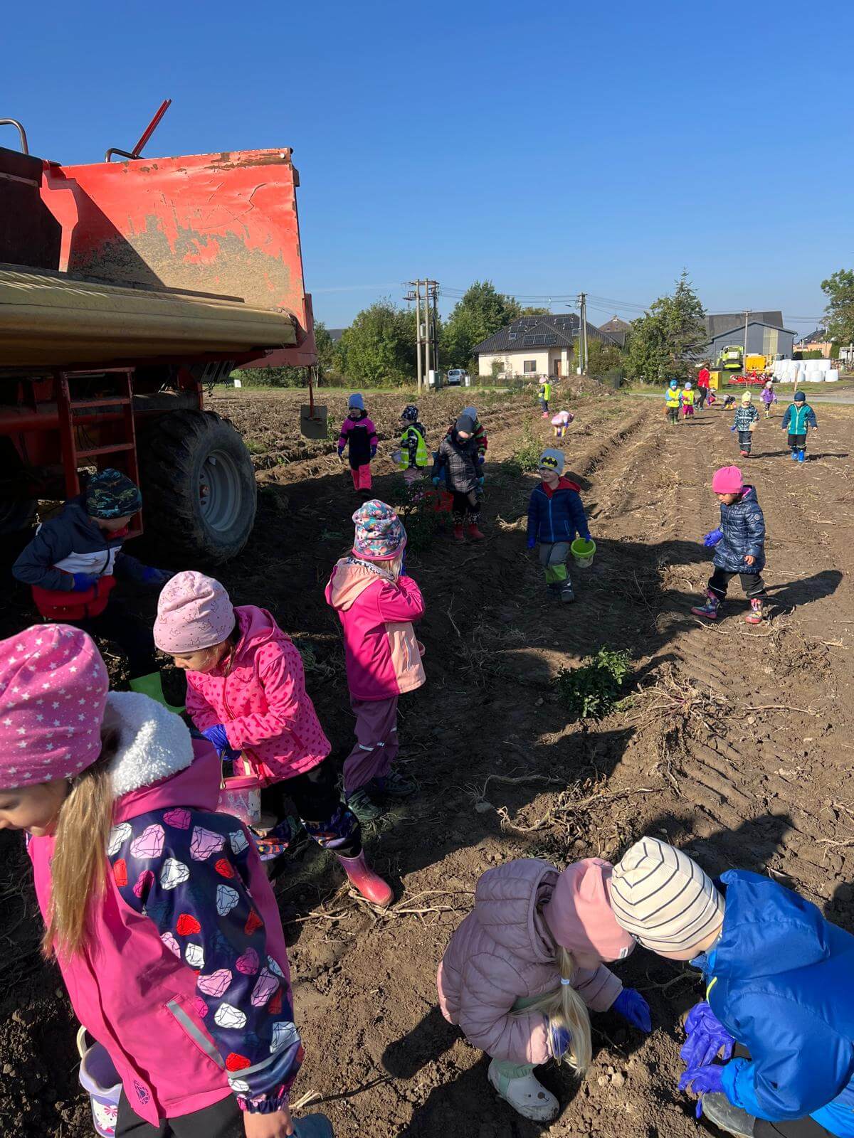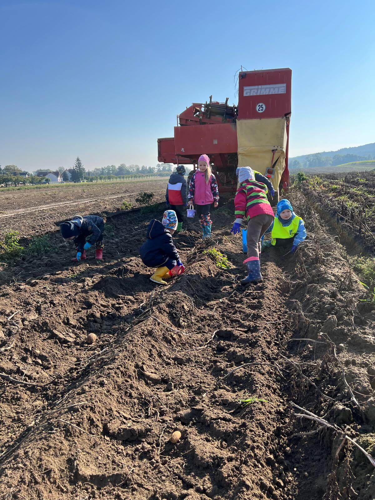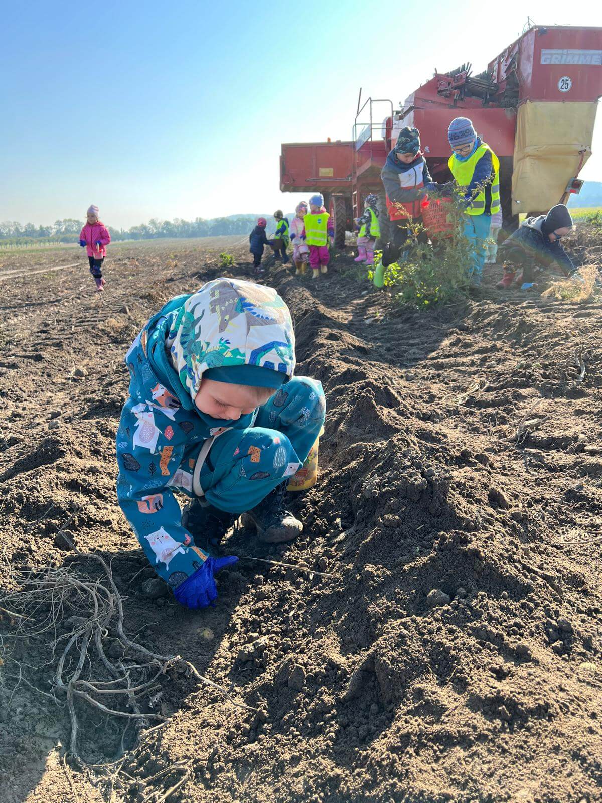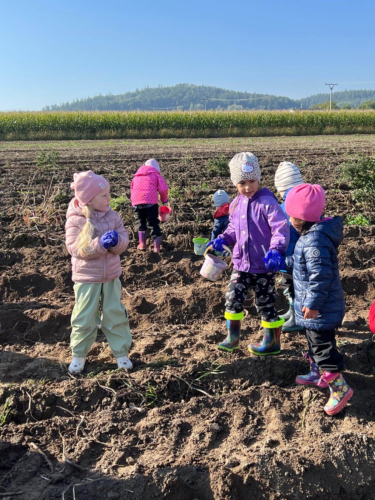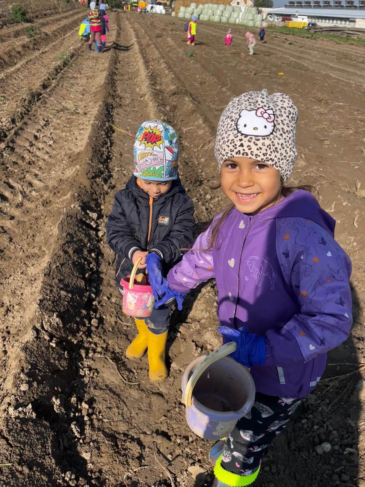 V pátek 3. 10. 2025 jsme se v rámci týdenního tématu vydali s dětmi ze třídy Berušky a Včelky na statek a pole rodiny Malohlavovi. Hned po příchodu na statek děti mohly vidět velký traktor a paní Danka Malohlavová si pro děti nachystala ochutnávku domácí mrkve a papriky a ukázala dětem nasbírané brambory ve tvaru srdíčka. Cestou na pole děti s obdivem a respektem pozorovaly malé i velké býky, různé zemědělské storoje jako traktory, vlečky a kombajny a hádaly, k čemu stroje slouží. Při příchodu na pole mohly děti už z dálky vidět stroj, jak zpracovává půdu a za ním si samy nasbíraly brambory do kyblíků. Kromě brambor viděly i trhání mrkve z řádku a pár mrkviček si odnesly i do mateřské školy, kde si na nich společně pochutnaly. Na závěr každý dostal malý balíček brambor, které si samy nasbíraly. Děti odcházely s úsměvem, plní zážitků a nových poznatků o tom, jak to na statku a na poli chodí. Tento den byl plný zábavy a radosti z objevování a my za tento zážitek moc děkujeme statku Malohlavovi. Veronika Smetanová