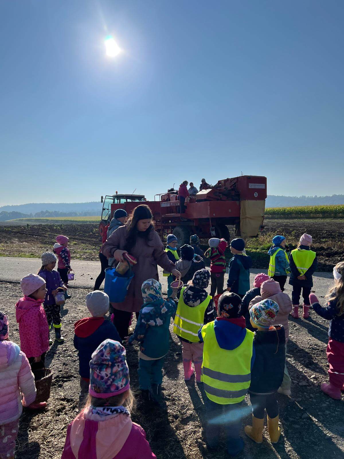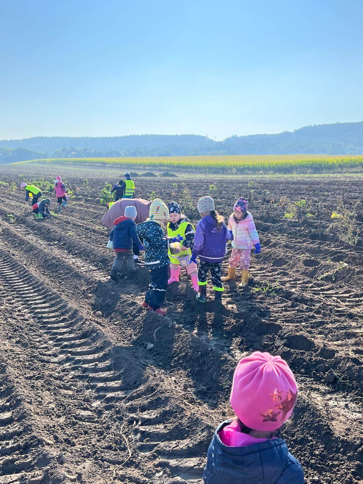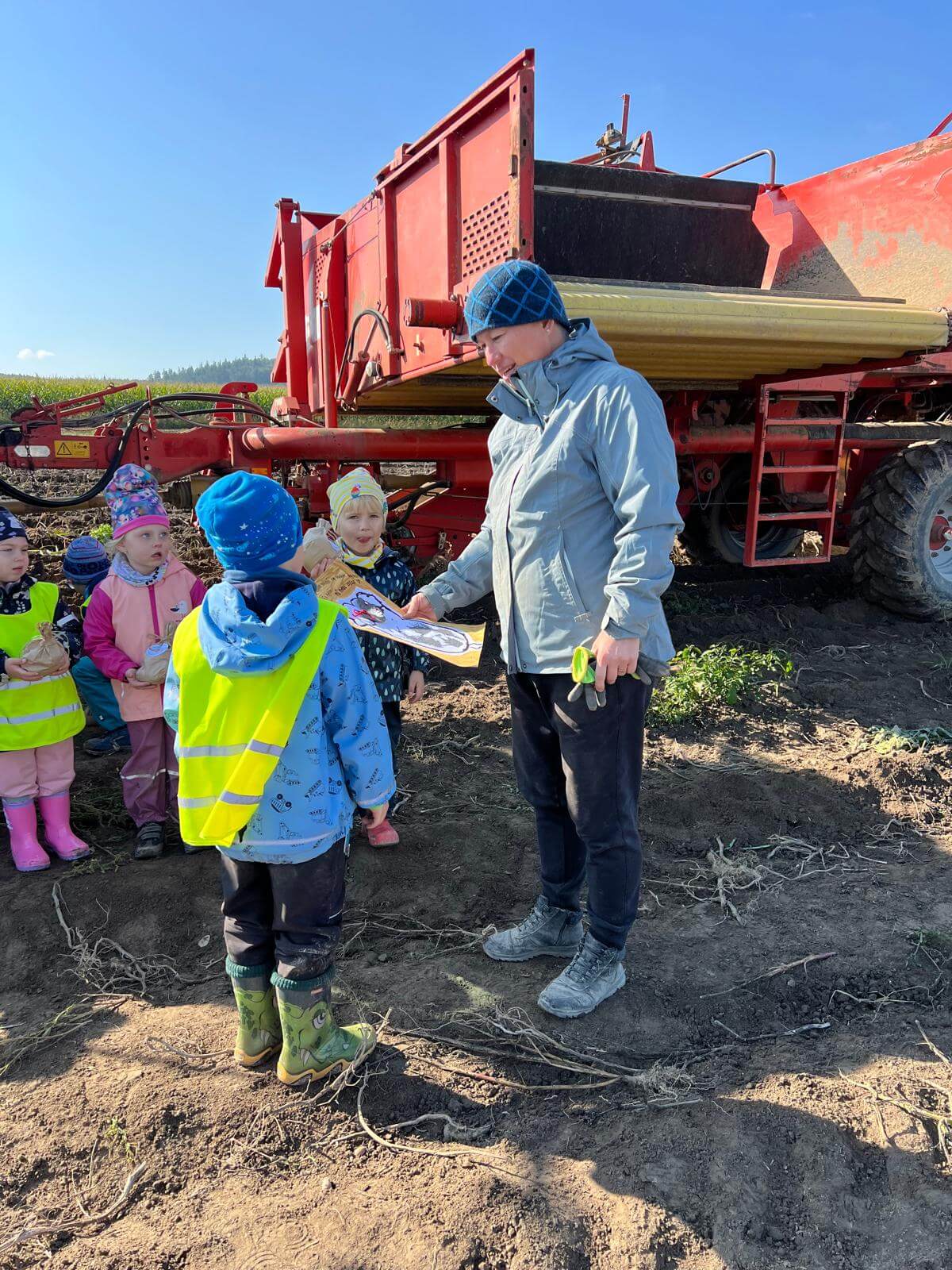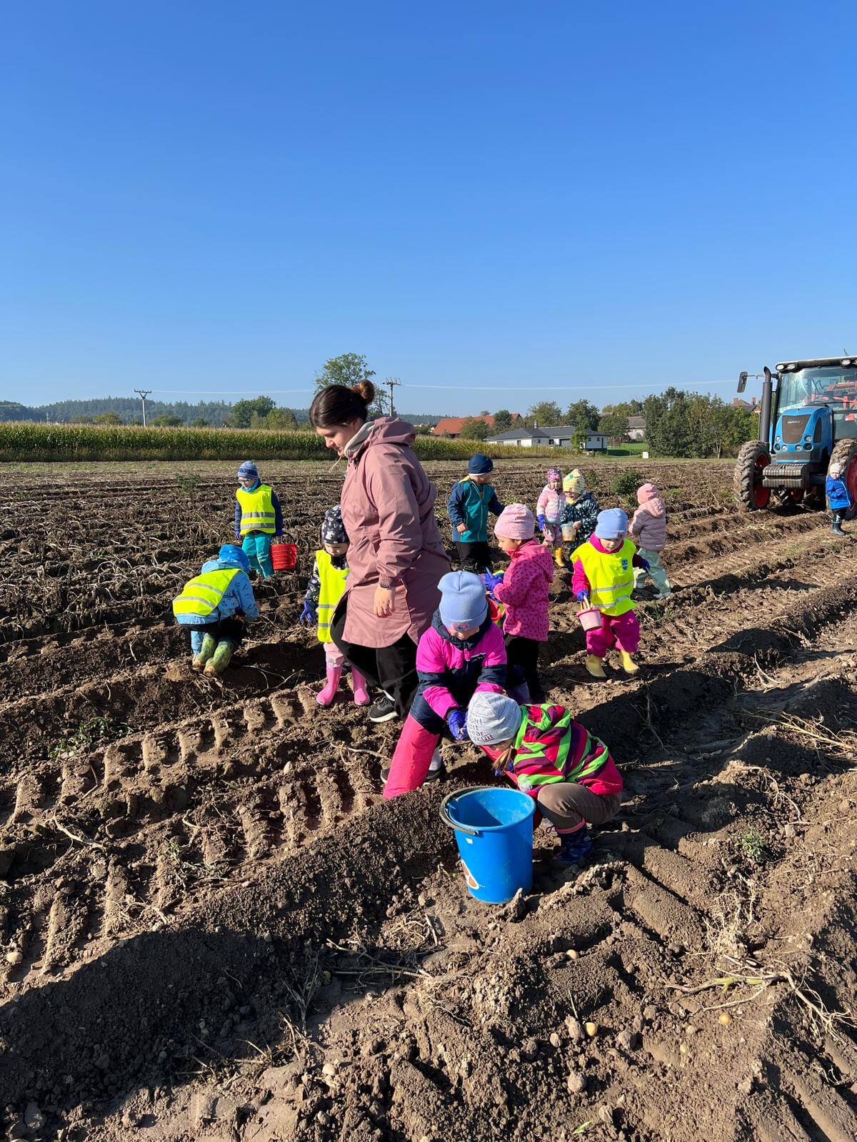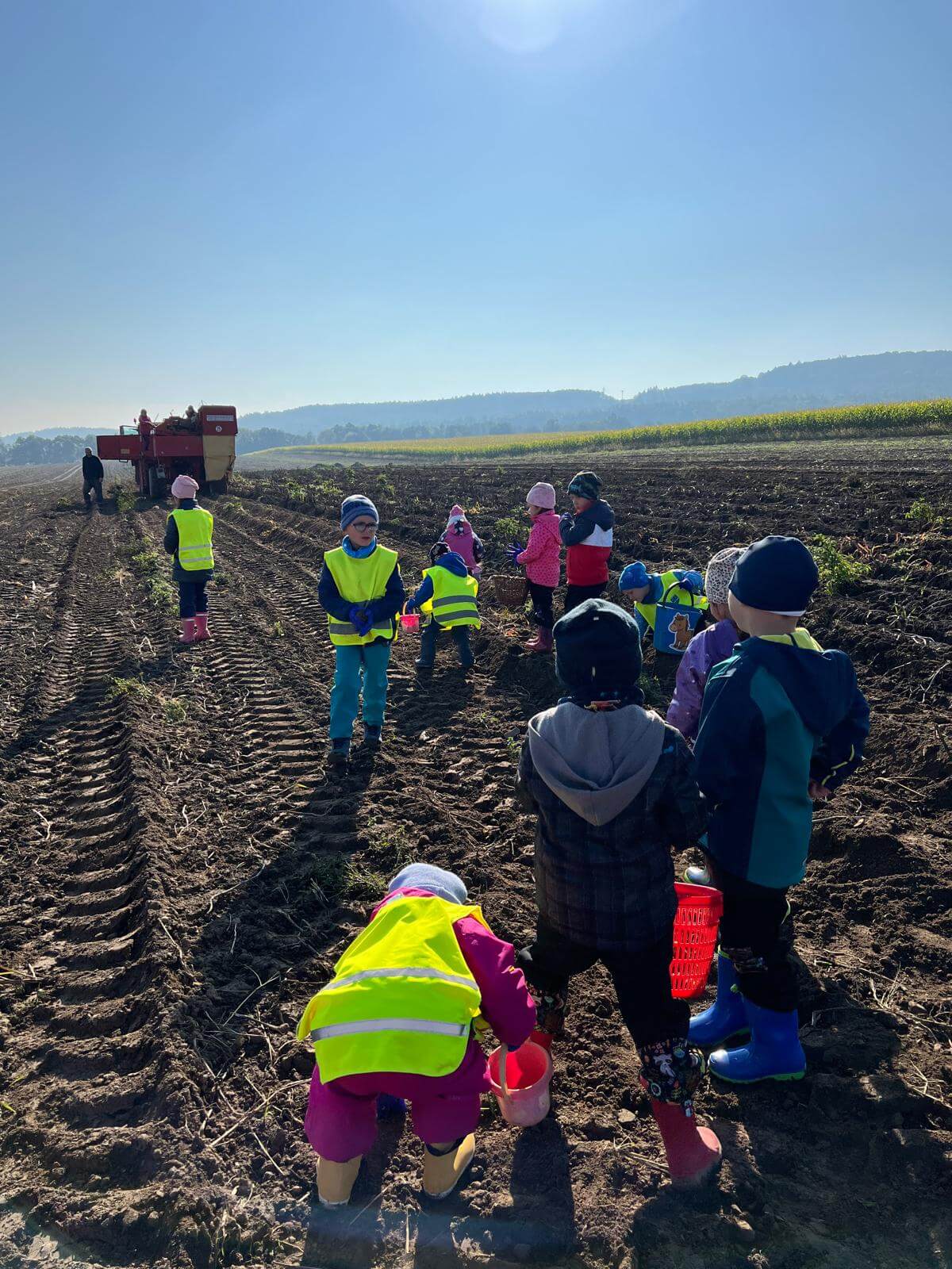 V pátek 3. 10. 2025 jsme se v rámci týdenního tématu vydali s dětmi ze třídy Berušky a Včelky na statek a pole rodiny Malohlavovi. Hned po příchodu na statek děti mohly vidět velký traktor a paní Danka Malohlavová si pro děti nachystala ochutnávku domácí mrkve a papriky a ukázala dětem nasbírané brambory ve tvaru srdíčka. Cestou na pole děti s obdivem a respektem pozorovaly malé i velké býky, různé zemědělské storoje jako traktory, vlečky a kombajny a hádaly, k čemu stroje slouží. Při příchodu na pole mohly děti už z dálky vidět stroj, jak zpracovává půdu a za ním si samy nasbíraly brambory do kyblíků. Kromě brambor viděly i trhání mrkve z řádku a pár mrkviček si odnesly i do mateřské školy, kde si na nich společně pochutnaly. Na závěr každý dostal malý balíček brambor, které si samy nasbíraly. Děti odcházely s úsměvem, plní zážitků a nových poznatků o tom, jak to na statku a na poli chodí. Tento den byl plný zábavy a radosti z objevování a my za tento zážitek moc děkujeme statku Malohlavovi. Veronika Smetanová