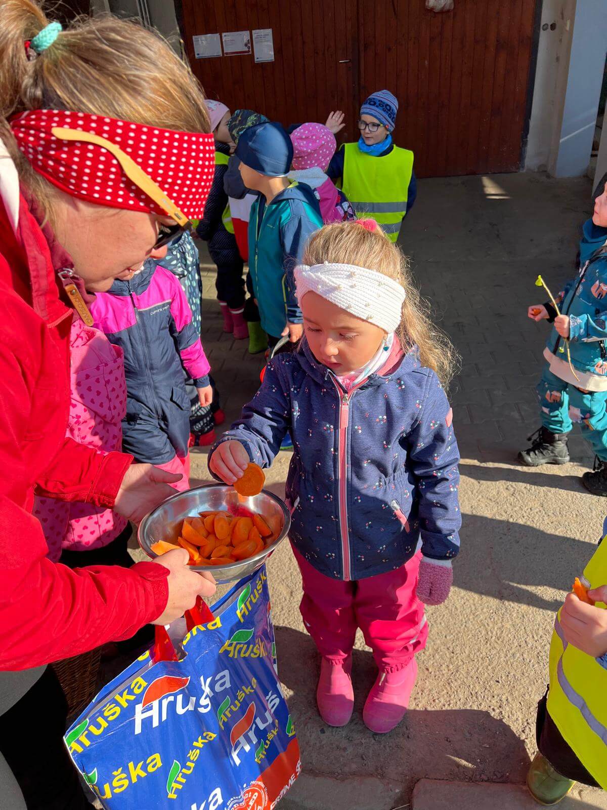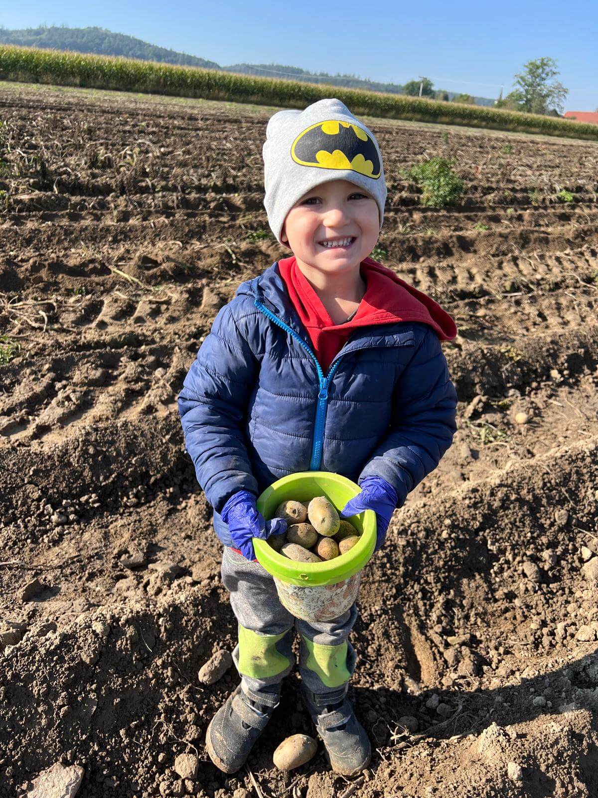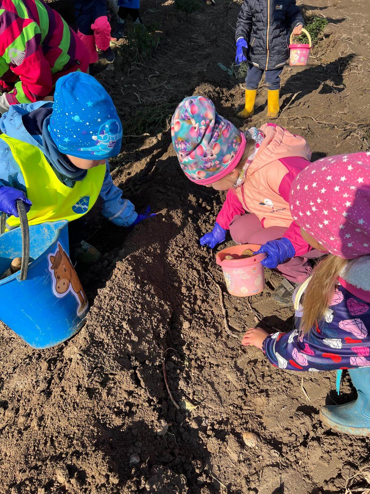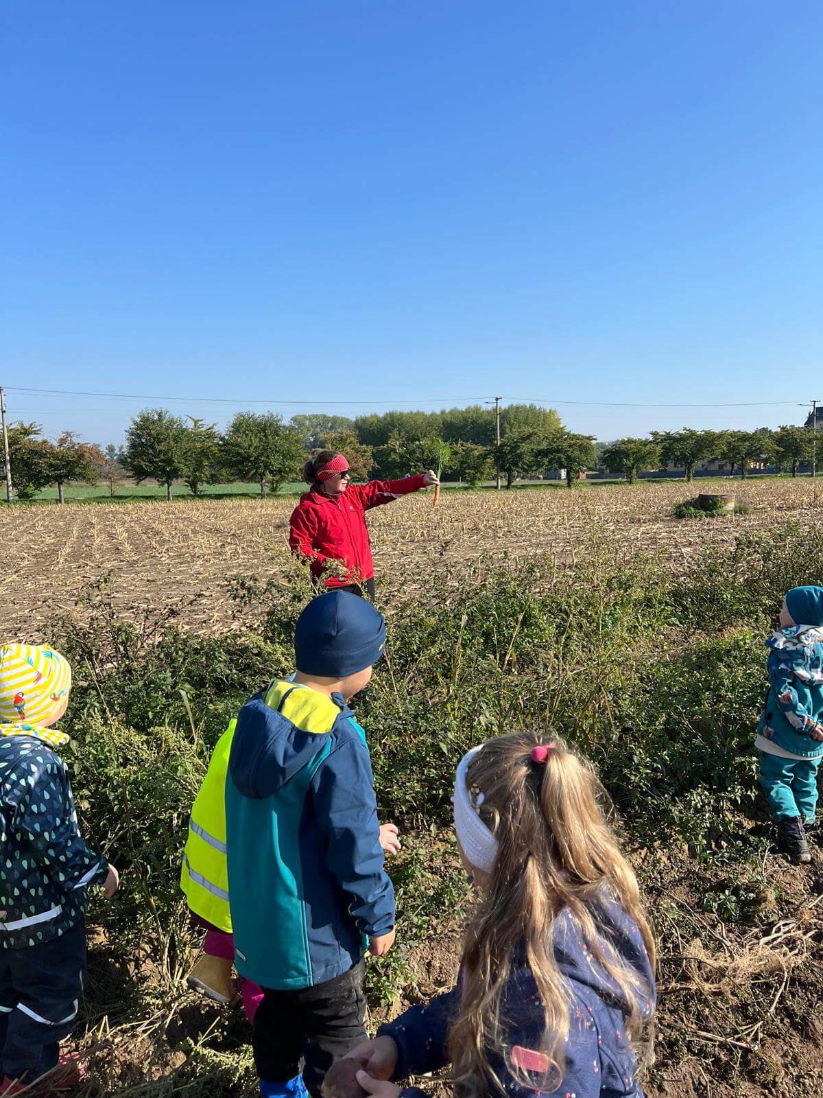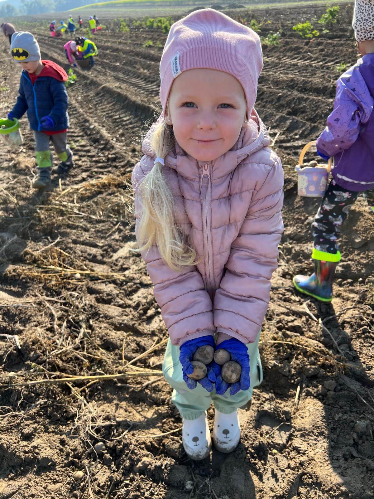 V pátek 3. 10. 2025 jsme se v rámci týdenního tématu vydali s dětmi ze třídy Berušky a Včelky na statek a pole rodiny Malohlavovi. Hned po příchodu na statek děti mohly vidět velký traktor a paní Danka Malohlavová si pro děti nachystala ochutnávku domácí mrkve a papriky a ukázala dětem nasbírané brambory ve tvaru srdíčka. Cestou na pole děti s obdivem a respektem pozorovaly malé i velké býky, různé zemědělské storoje jako traktory, vlečky a kombajny a hádaly, k čemu stroje slouží. Při příchodu na pole mohly děti už z dálky vidět stroj, jak zpracovává půdu a za ním si samy nasbíraly brambory do kyblíků. Kromě brambor viděly i trhání mrkve z řádku a pár mrkviček si odnesly i do mateřské školy, kde si na nich společně pochutnaly. Na závěr každý dostal malý balíček brambor, které si samy nasbíraly. Děti odcházely s úsměvem, plní zážitků a nových poznatků o tom, jak to na statku a na poli chodí. Tento den byl plný zábavy a radosti z objevování a my za tento zážitek moc děkujeme statku Malohlavovi. Veronika Smetanová