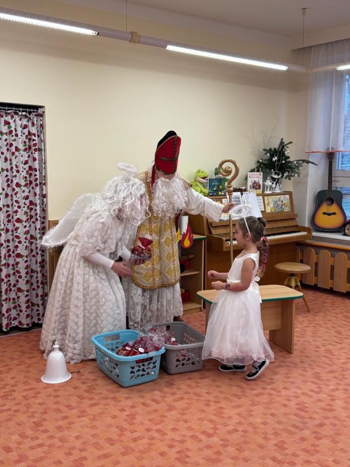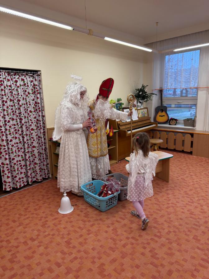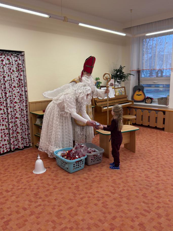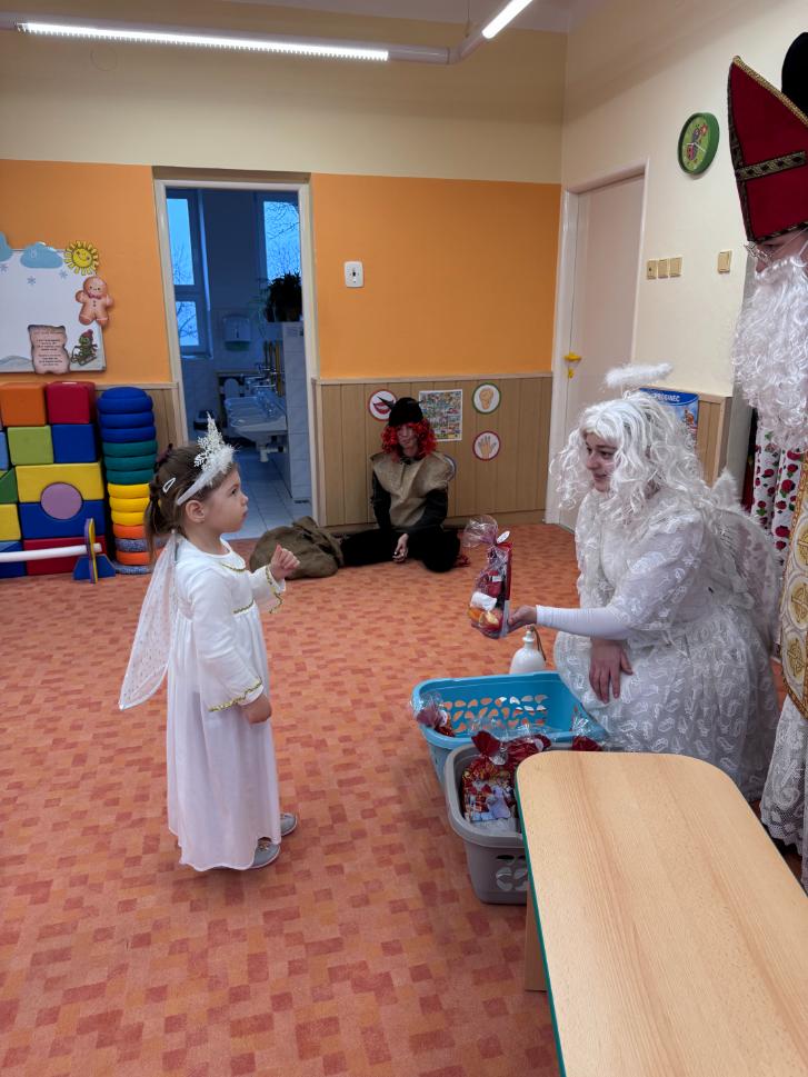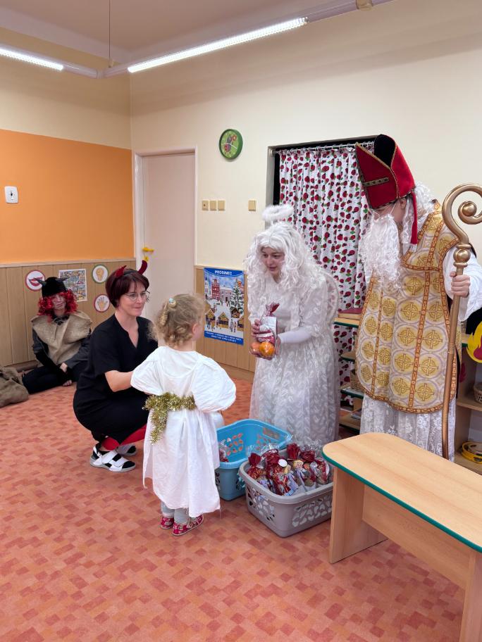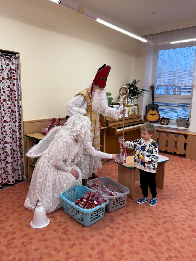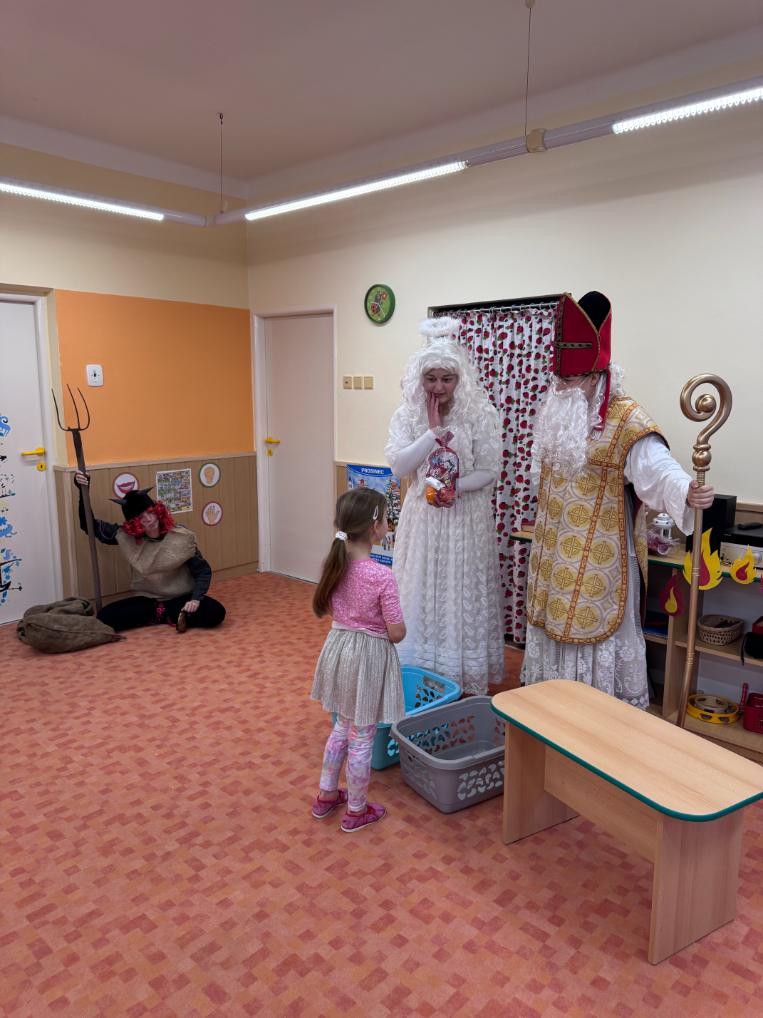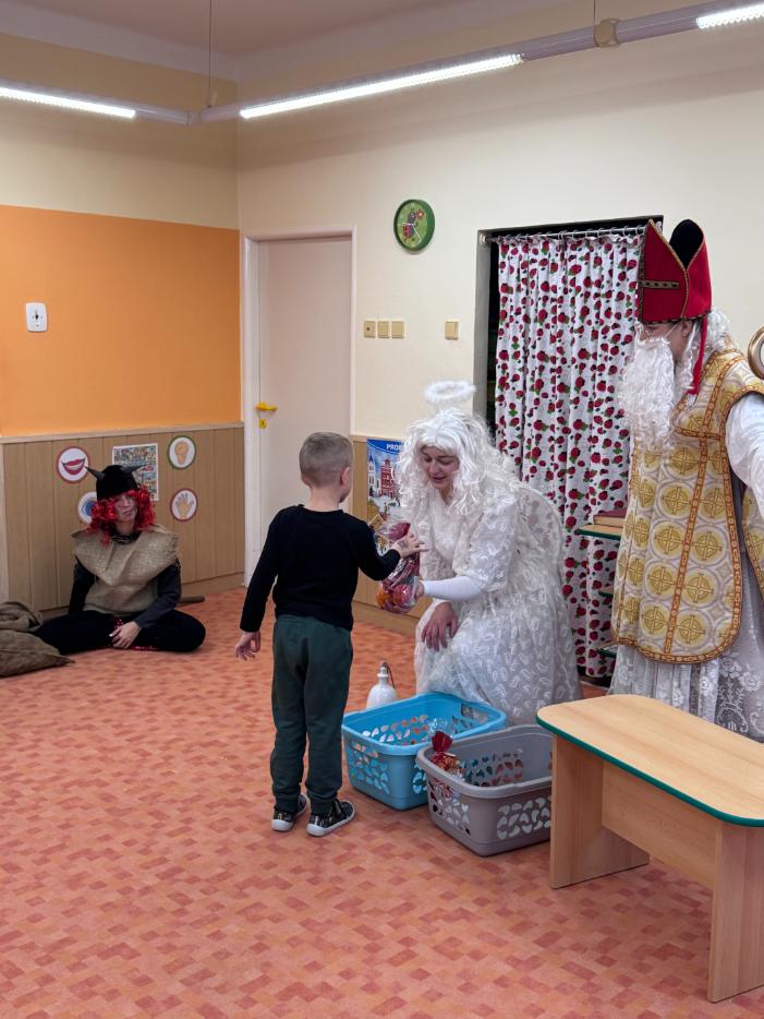 V pátek zavítal do naší mateřské školy dlouho očekávaný host – Mikuláš, kterého doprovázel anděl a samozřejmě také čert. Děti se na setkání pilně připravovaly, naučily se písničku pro čerta a básničky pro Mikuláše a anděla. Když se otevřely dveře a vstoupila celá mikulášská trojice, ozvalo se překvapení, smích, ale i pár nesmělých zamrkání. Mikuláš děti přivítal a pochválil je za to, jak jsou šikovné a jak si spolu pěkně hrají. Děti postupně předvedly, co si připravily. Anděl vlídně chválil, čert vtipně postrašil, ale nikoho nevyděsil. Za své vystoupení dostaly děti balíček se sladkostmi a ovocem. Návštěva Mikuláše přinesla do školky radost, úsměvy a také trochu tajemného kouzla, které k tomuto období neodmyslitelně patří. Dětem zůstaly krásné vzpomínky a těší se, že i příští rok Mikuláš opět zavítá mezi ně. Renata Žižlavská