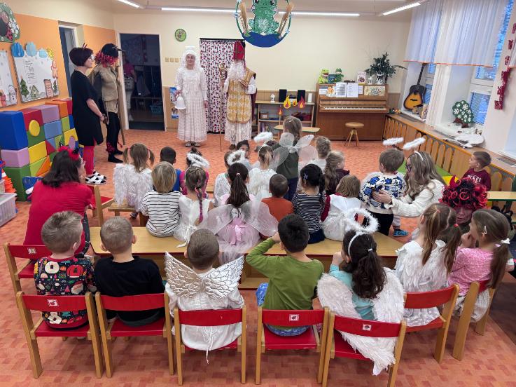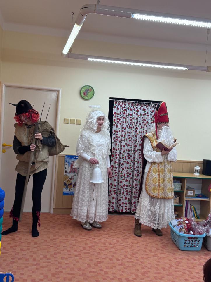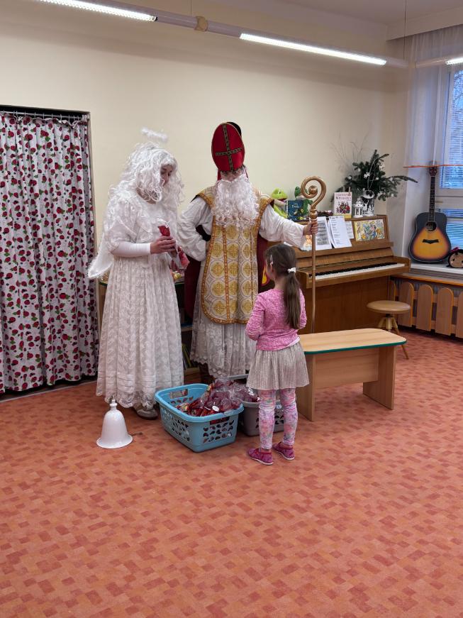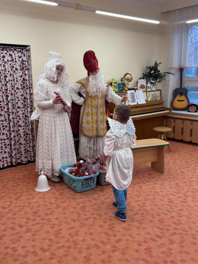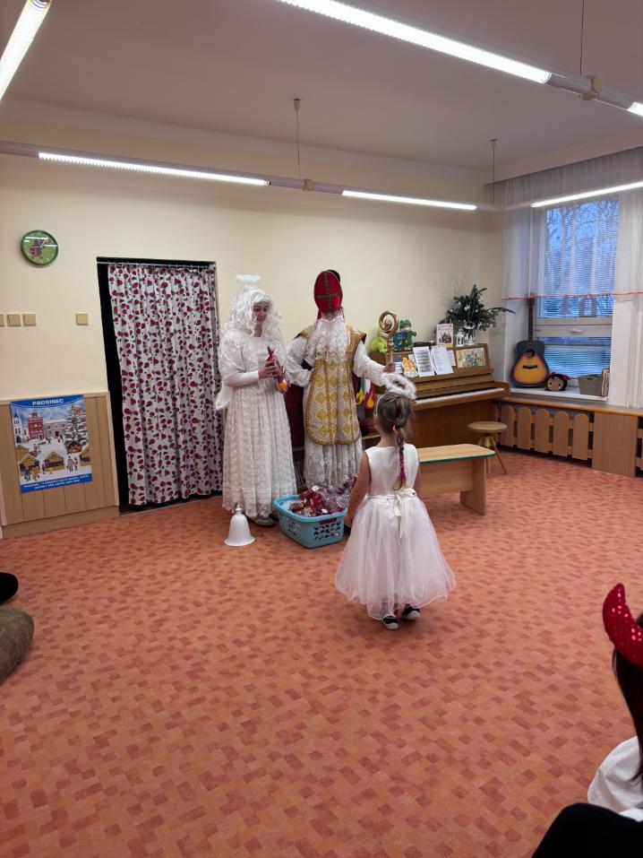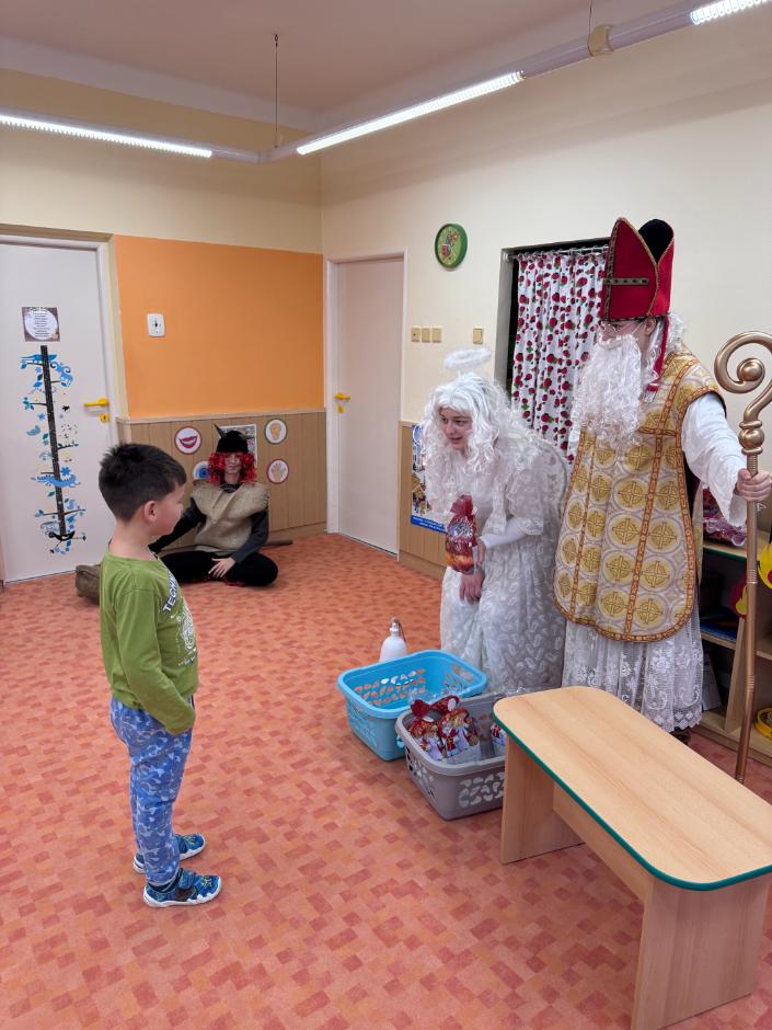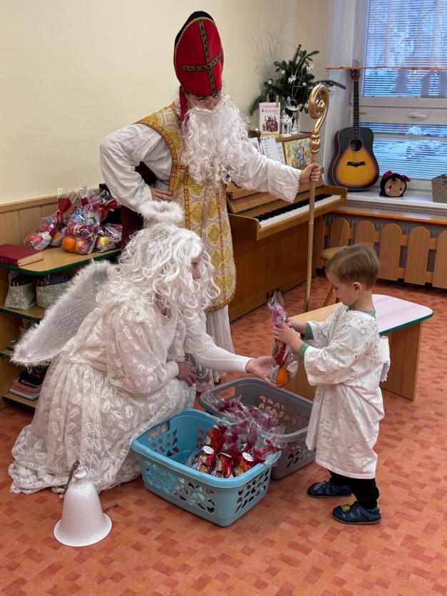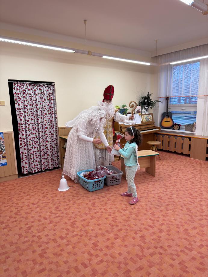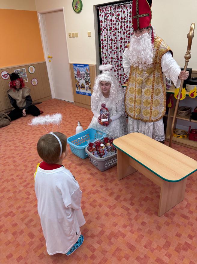 V pátek zavítal do naší mateřské školy dlouho očekávaný host – Mikuláš, kterého doprovázel anděl a samozřejmě také čert. Děti se na setkání pilně připravovaly, naučily se písničku pro čerta a básničky pro Mikuláše a anděla. Když se otevřely dveře a vstoupila celá mikulášská trojice, ozvalo se překvapení, smích, ale i pár nesmělých zamrkání. Mikuláš děti přivítal a pochválil je za to, jak jsou šikovné a jak si spolu pěkně hrají. Děti postupně předvedly, co si připravily. Anděl vlídně chválil, čert vtipně postrašil, ale nikoho nevyděsil. Za své vystoupení dostaly děti balíček se sladkostmi a ovocem. Návštěva Mikuláše přinesla do školky radost, úsměvy a také trochu tajemného kouzla, které k tomuto období neodmyslitelně patří. Dětem zůstaly krásné vzpomínky a těší se, že i příští rok Mikuláš opět zavítá mezi ně. Renata Žižlavská