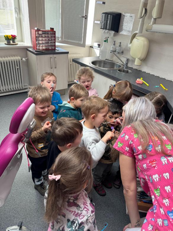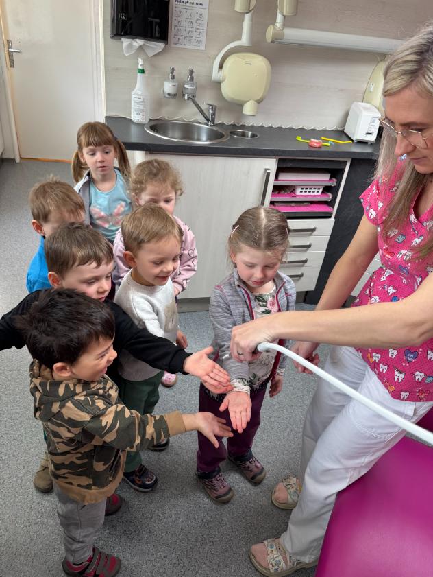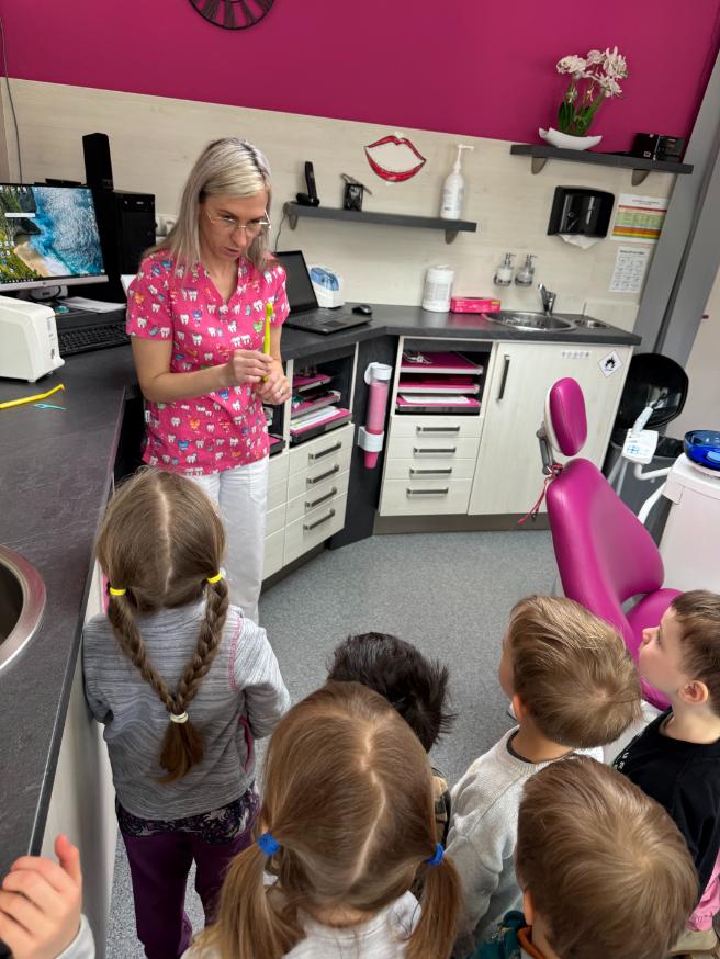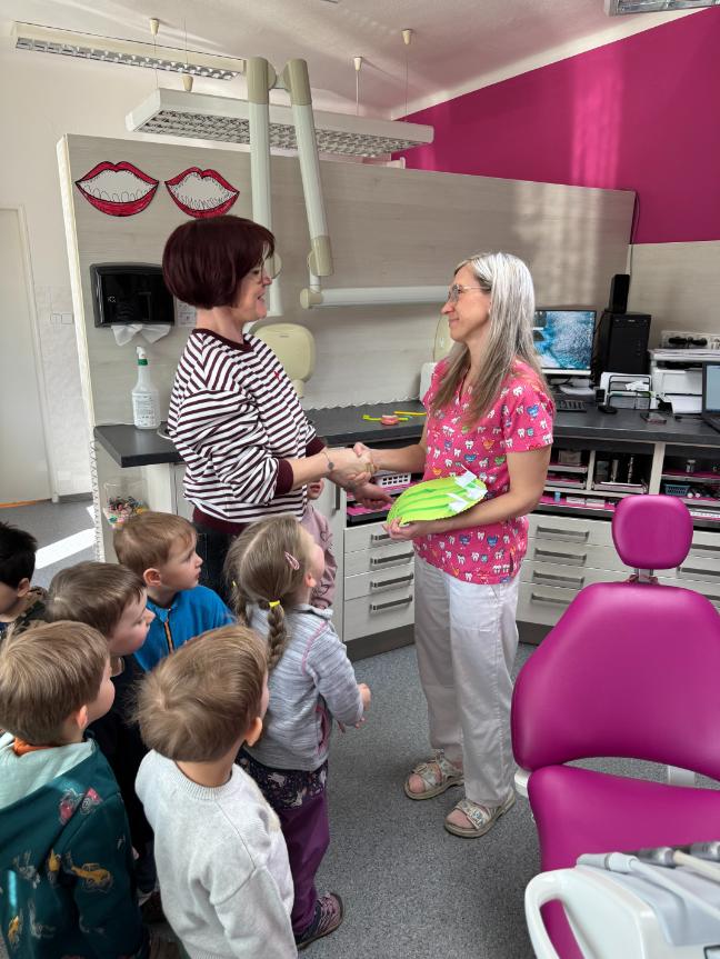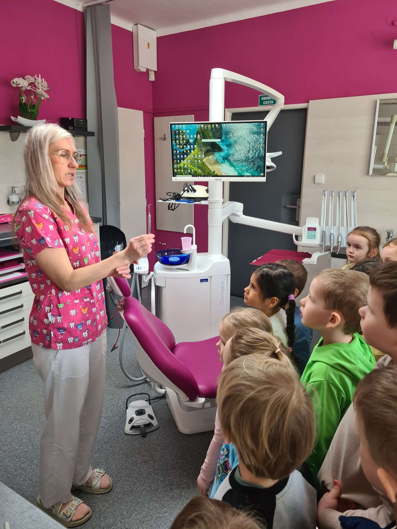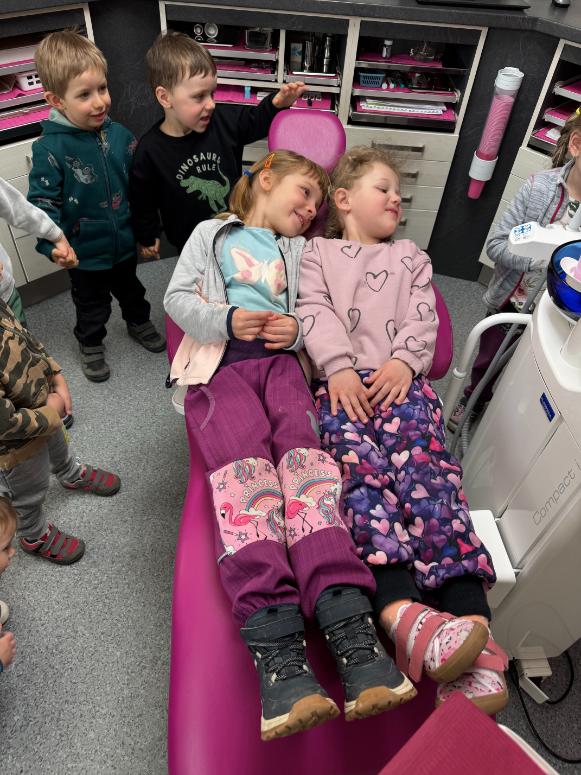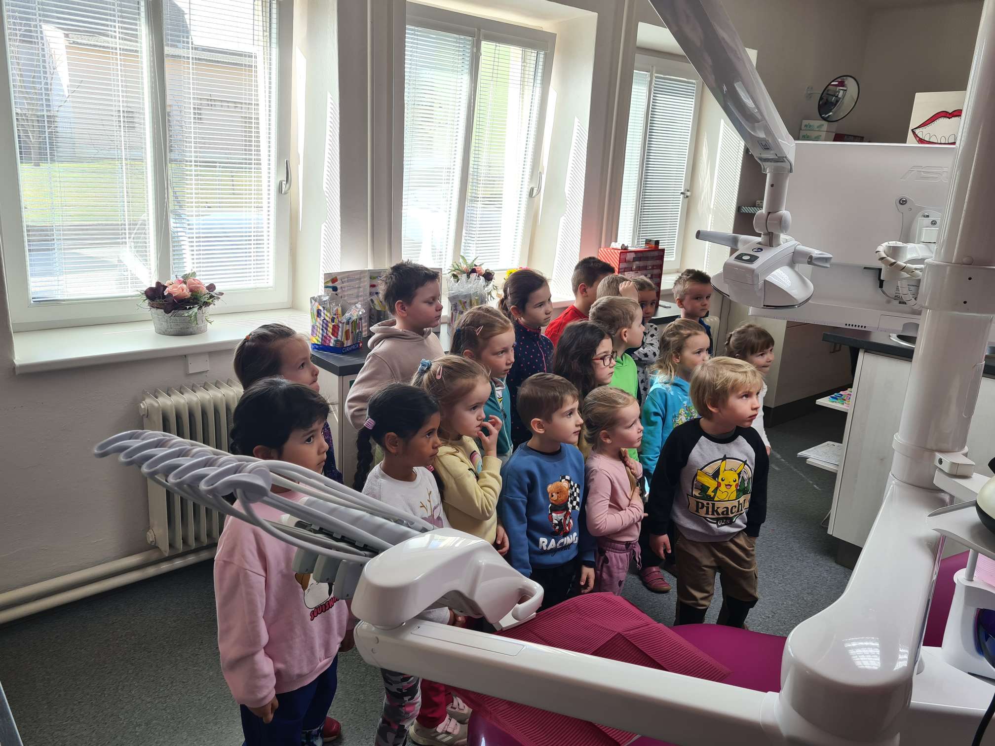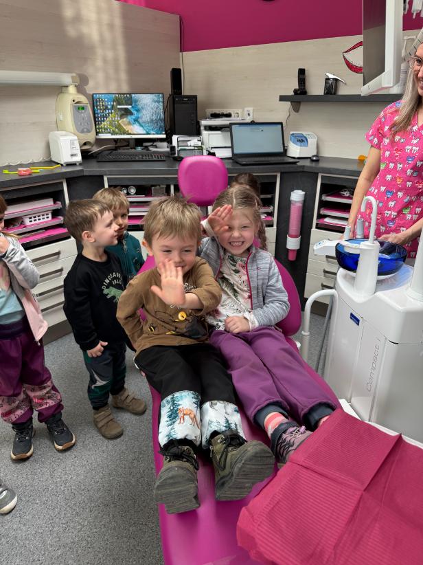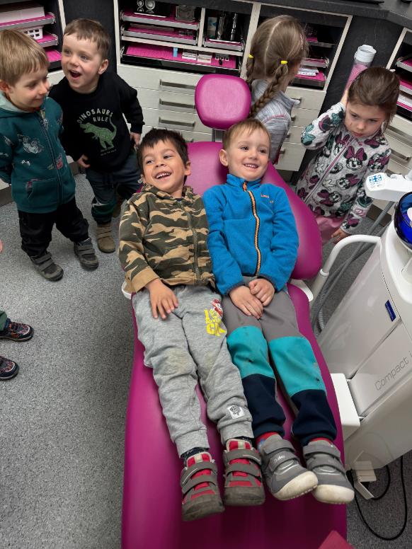 V rámci našeho tematického bloku zaměřeného na zdraví jsme se s dětmi z mateřské školy vydali na zajímavou a poučnou návštěvu místní zubní ordinace. Cílem bylo dětem přiblížit prostředí zubní ordinace a ukázat jim, že návštěvy u zubaře se nemusí vůbec bát. Paní Šimečková, sestřička paní zubařky, nás mile přivítala a připravila si pro děti krátké povídání o tom, jak se o zoubky starat a jak si je správně čistit. Velkým zážitkem pro děti bylo také seznámení s různými přístroji a pomůckami, které paní zubařka při své práci používá. Děti si mohly některé z nich zblízka prohlédnout a dozvědět se, k čemu slouží. Největší nadšení však vyvolalo zubařské křeslo – každý, kdo chtěl, si do něj mohl sednout a dokonce se na něm i povozit. Návštěva probíhala ve velmi přátelské atmosféře a děti odcházely z ordinace plné nových zážitků i poznatků. Na závěr dostaly na památku malý dáreček, který jim bude tuto milou návštěvu připomínat. Paní Šimečkové moc děkujeme za její čas, ochotu a krásné přijetí. Díky této návštěvě si děti odnesly nejen nové zkušenosti, ale také možná o trochu menší obavy z návštěvy zubní ordinace. Veronika Smetanová