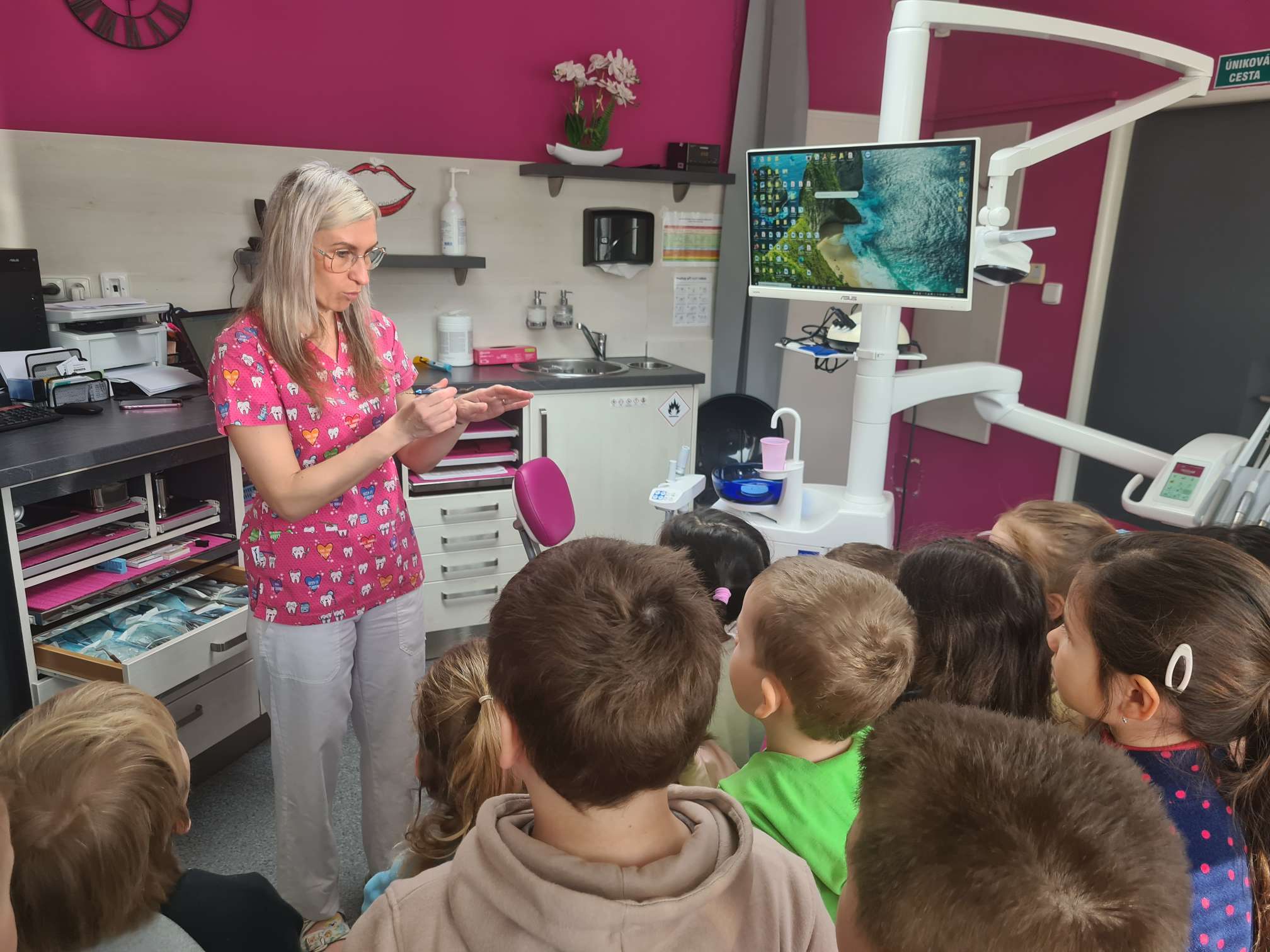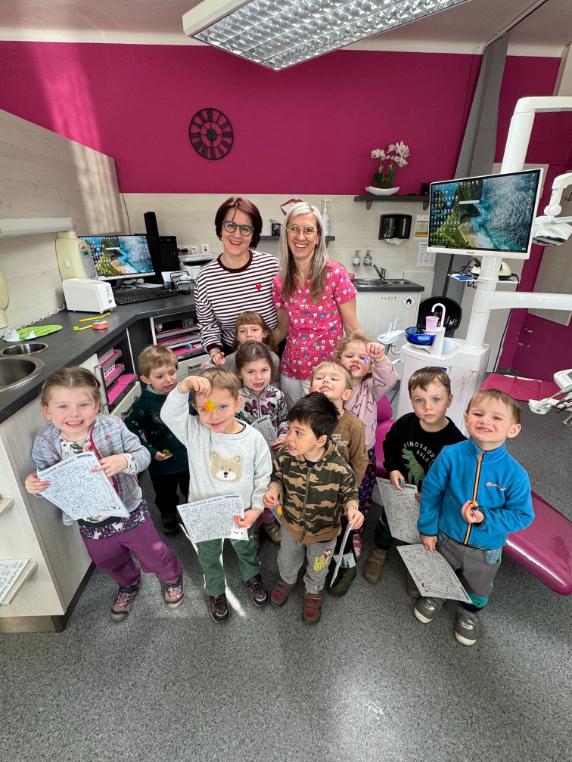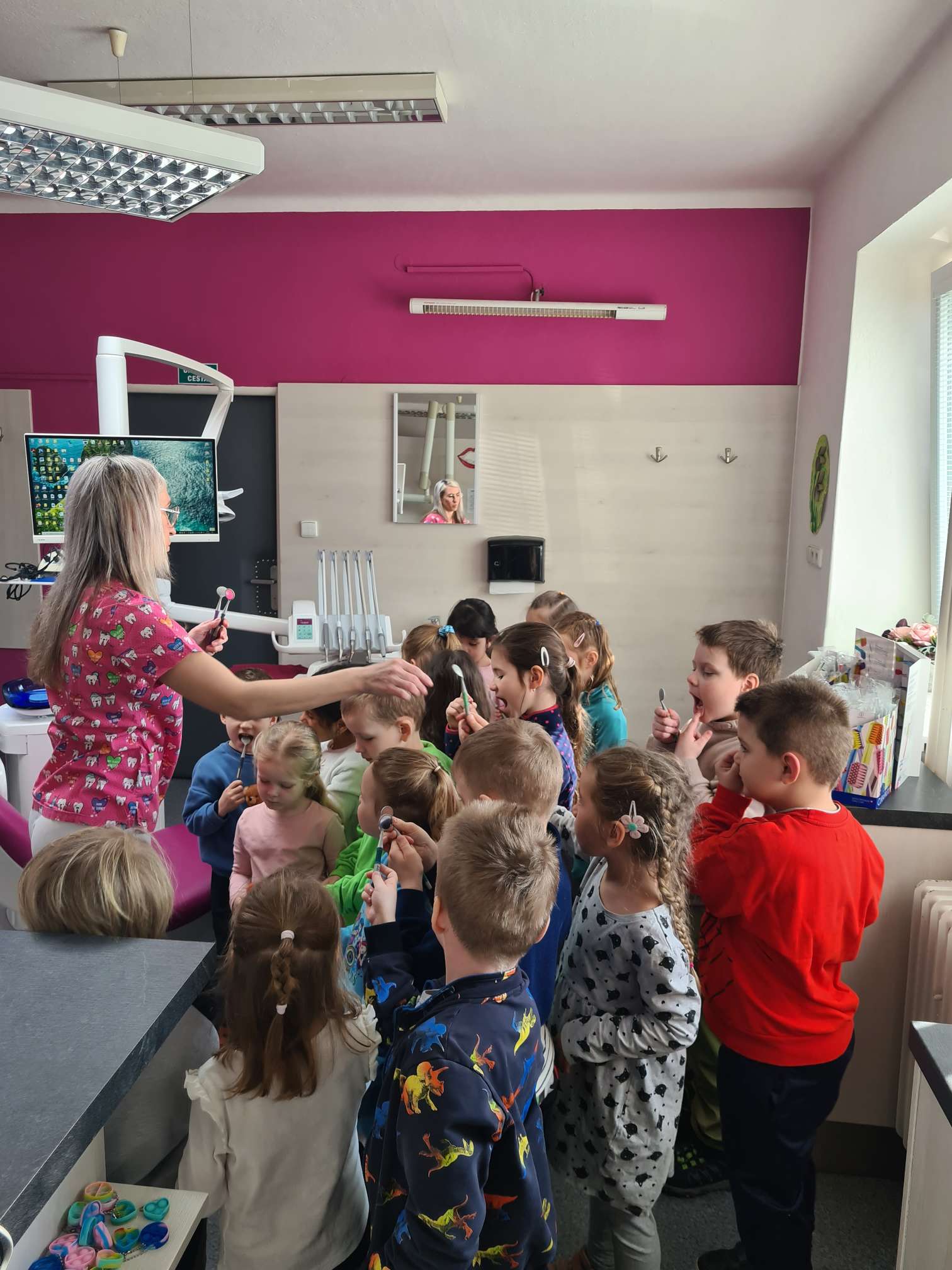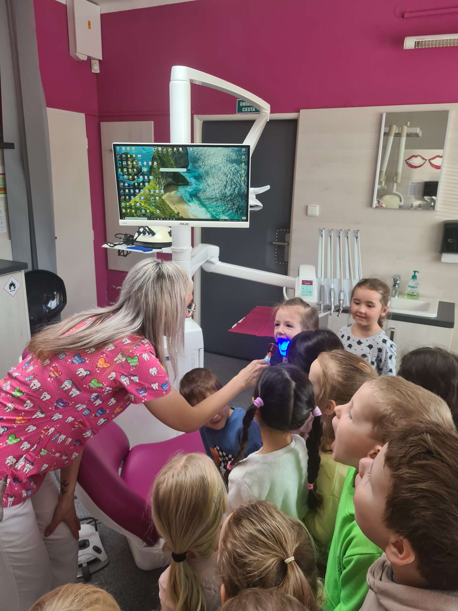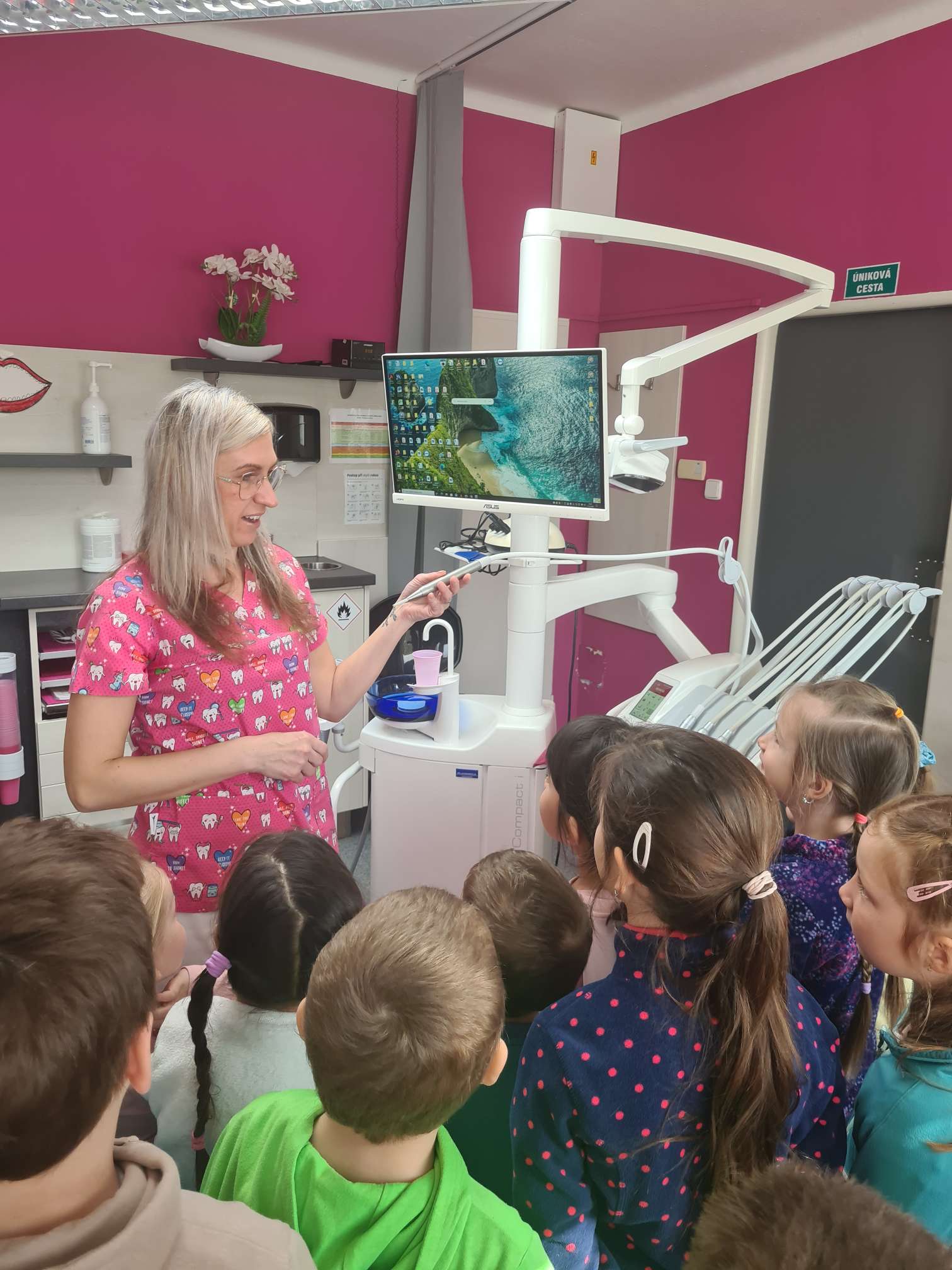 V rámci našeho tematického bloku zaměřeného na zdraví jsme se s dětmi z mateřské školy vydali na zajímavou a poučnou návštěvu místní zubní ordinace. Cílem bylo dětem přiblížit prostředí zubní ordinace a ukázat jim, že návštěvy u zubaře se nemusí vůbec bát. Paní Šimečková, sestřička paní zubařky, nás mile přivítala a připravila si pro děti krátké povídání o tom, jak se o zoubky starat a jak si je správně čistit. Velkým zážitkem pro děti bylo také seznámení s různými přístroji a pomůckami, které paní zubařka při své práci používá. Děti si mohly některé z nich zblízka prohlédnout a dozvědět se, k čemu slouží. Největší nadšení však vyvolalo zubařské křeslo – každý, kdo chtěl, si do něj mohl sednout a dokonce se na něm i povozit. Návštěva probíhala ve velmi přátelské atmosféře a děti odcházely z ordinace plné nových zážitků i poznatků. Na závěr dostaly na památku malý dáreček, který jim bude tuto milou návštěvu připomínat. Paní Šimečkové moc děkujeme za její čas, ochotu a krásné přijetí. Díky této návštěvě si děti odnesly nejen nové zkušenosti, ale také možná o trochu menší obavy z návštěvy zubní ordinace. Veronika Smetanová