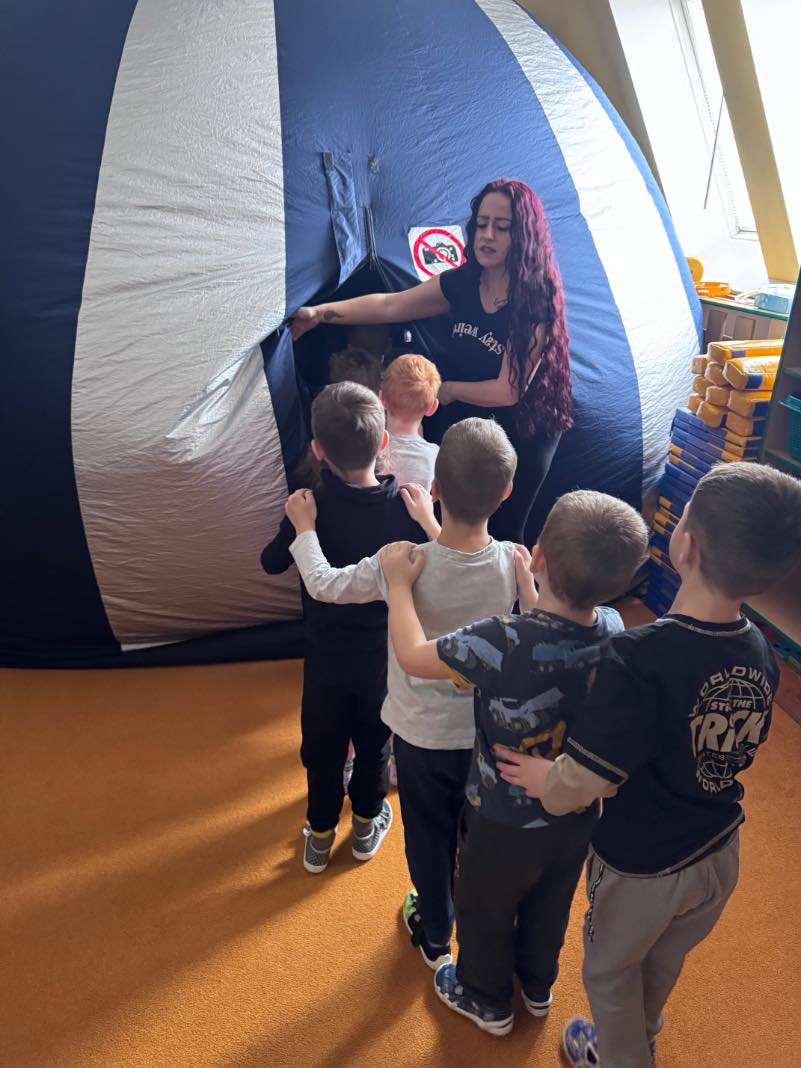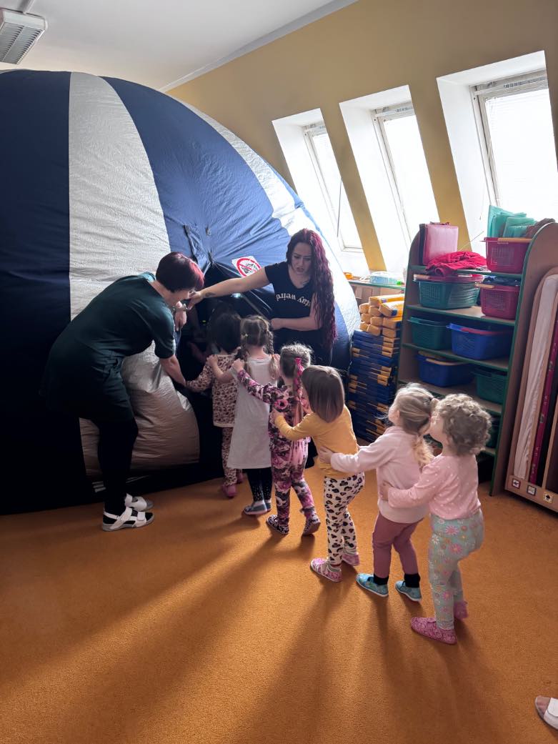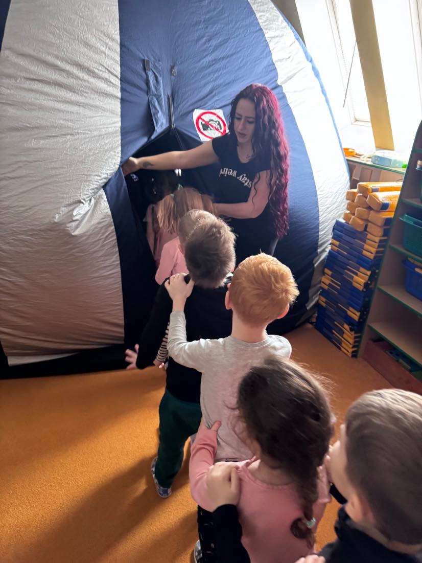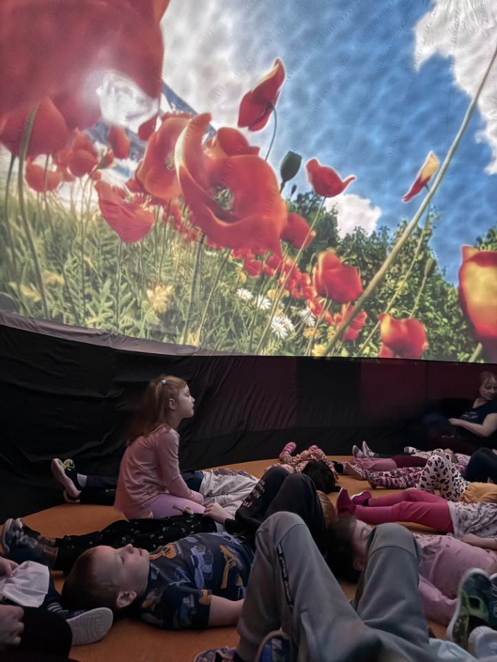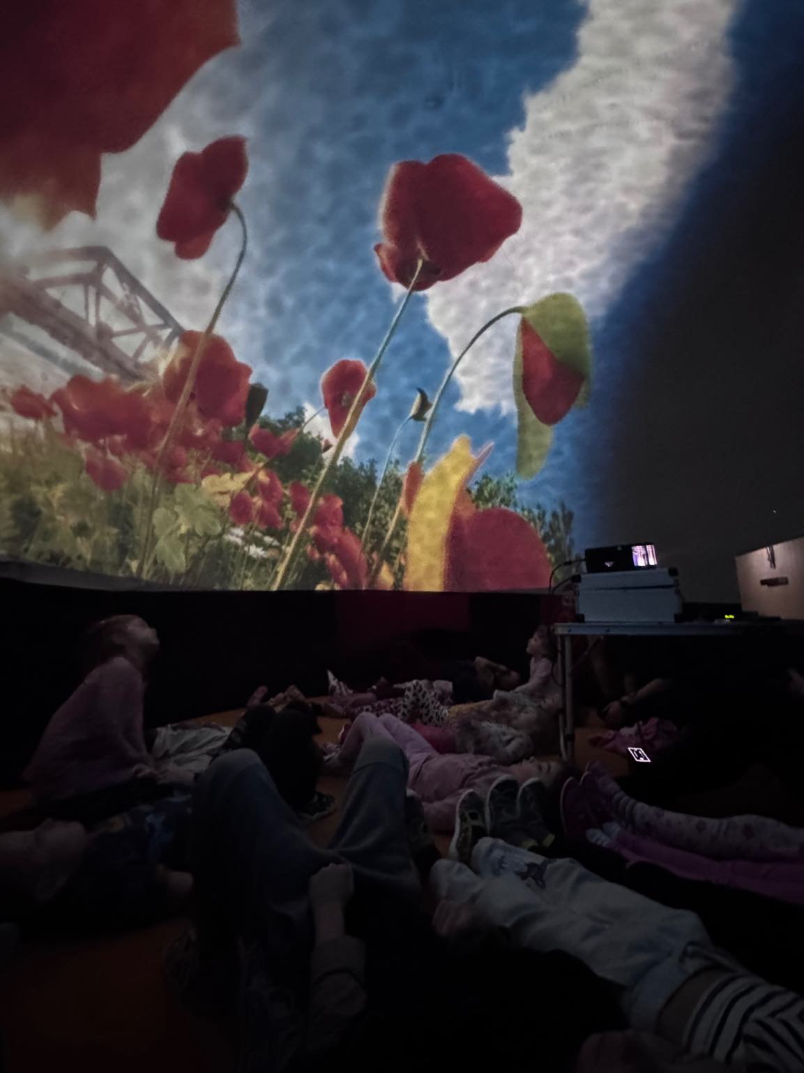 V pondělí 24. 2. proběhla v dopoledních hodinách vzdělávací projekce v technologii 360°, odhalující fakta o cestě slunce po obloze se změnami ročního období. Ve speciálním rozkládacím stanu, který po nafouknutí dostal tvar kopule, měly děti možnost zhlédnout příběh o malé holčičce, která se vydala na prázdniny k dědečkovi, kde poznávala rozmanitost počasí a světa kolem sebe. Děti měly možnost zažít pocit, jaké to je nacházet se v hrozivě ledových teplotách, ale i v perném horku. Promítání v tomto přenosném kině dětem umožnilo vzbudit zájem o okolní svět, a také doplnit znalosti a uspokojit svou zvědavost. Děti sledovaly projekci s velkým zájmem a byl to pro ně nevšední zážitek. Renata Žižlavská